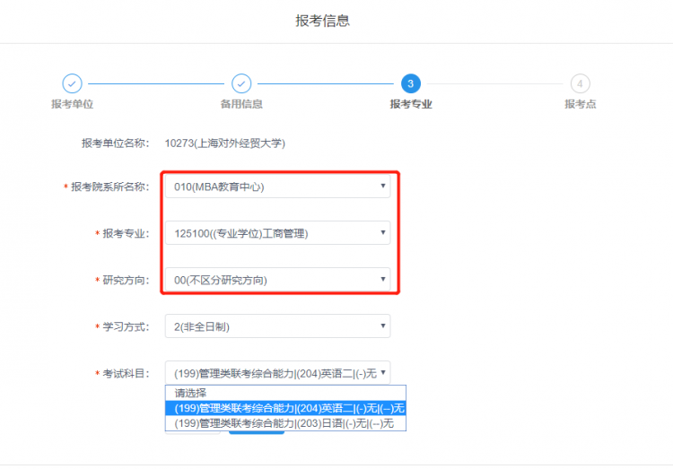 招生單位選擇“上海市”及“10273上海對外經(jīng)貿(mào)大學”