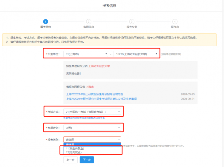 ● 報考類別中報考非全日制項目請選擇“12(定向就業(yè))”(請?zhí)顚懏斍熬蜆I(yè)信息)