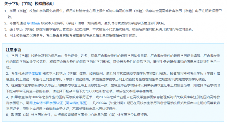 1、在報名期間內(nèi)可“查看已填報信息”、“修改已填報信息”、“下載報名信息表”以及“學歷(學籍)校驗結(jié)果”。其中招生單位、考試方式及報考點等信息是不可修改的內(nèi)容;請在網(wǎng)報結(jié)束前登錄并確認所填信息,建議將所有信息保存或打印。