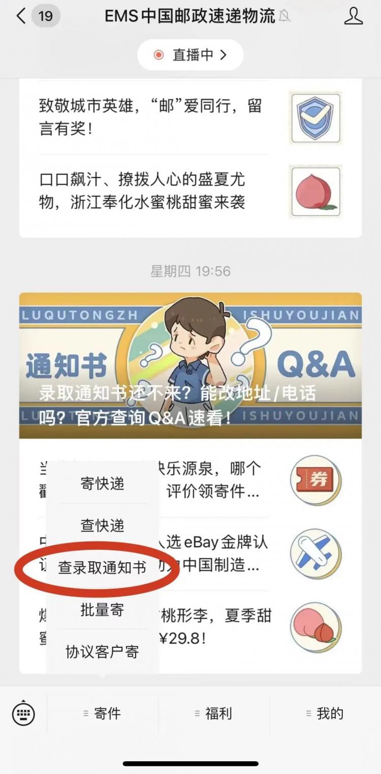 關(guān)注“EMS中國郵政速遞物流”公眾號,點擊“寄件-查錄取通知書”,輸入考生號(14位)即可查詢。