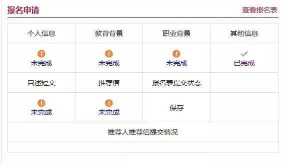 網(wǎng)上申請(qǐng)系統(tǒng)需填寫(xiě)信息分為個(gè)人信息、教育背景、職業(yè)背景、其他信息、自述短文、推薦信(1-2封)。