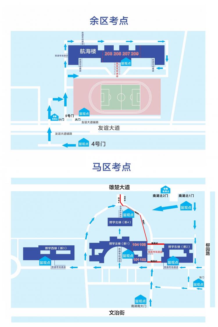 1.到南湖校區(qū)博學(xué)主樓(新1)、博學(xué)東樓(新2)、博學(xué)西樓(新3)或博學(xué)北樓(新4)考試的普通考生可從南門(文治街)和東門(文薈街)進(jìn)入,步行至教學(xué)樓分別需要大約18分鐘和10分鐘??记?4天內(nèi)有外省行程的考生從南湖校區(qū)北門(雄楚大道)進(jìn)入并出示48小時(shí)內(nèi)湖北省核酸檢測紙質(zhì)報(bào)告,步行至教學(xué)樓需要大約8分鐘。請考生提前預(yù)留充足的步行時(shí)間。