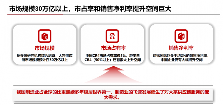 我國制造業(yè)全球占比連續(xù)多年穩(wěn)居世界第一,據(jù)多家機構(gòu)綜合測算,國內(nèi)大宗供應(yīng)鏈?zhǔn)袌鲆?guī)模預(yù)計在30萬億以上。