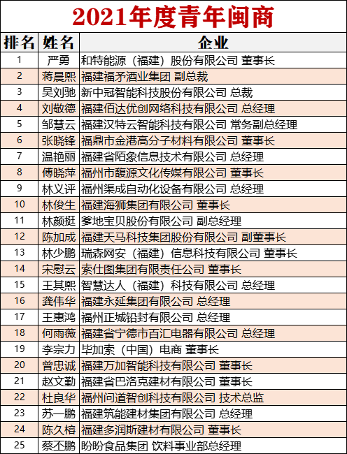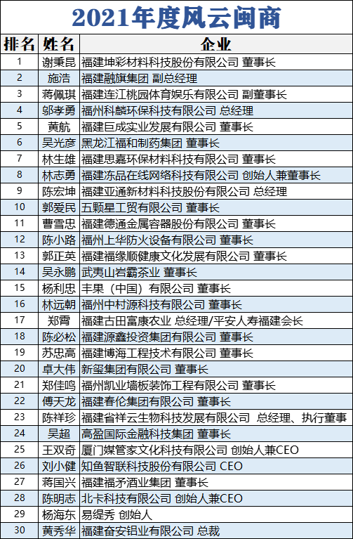在專家評審環(huán)節(jié),福建民營經(jīng)濟(jì)科技創(chuàng)新組委會特邀各界領(lǐng)導(dǎo)、業(yè)內(nèi)專家、財經(jīng)學(xué)者、行業(yè)分析師,對入圍的企業(yè)進(jìn)行了各個維度的分析與打分。最終推選出了30位“2021年度風(fēng)云閩商”與25位“2021年度青年閩商”,名單如下。其中,有不少廈門大學(xué)EMBA校友。