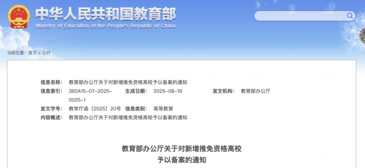 剛剛,教育部辦公廳發(fā)布《關(guān)于對新增推免資格高校予以備案的通知》。