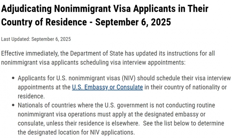 美國(guó)國(guó)務(wù)院9月6日突然在官網(wǎng)發(fā)布公告,宣布即日起,美國(guó)國(guó)務(wù)院對(duì)所有非移民簽證(NIV)申請(qǐng)者預(yù)約面談的規(guī)定作出更新:
