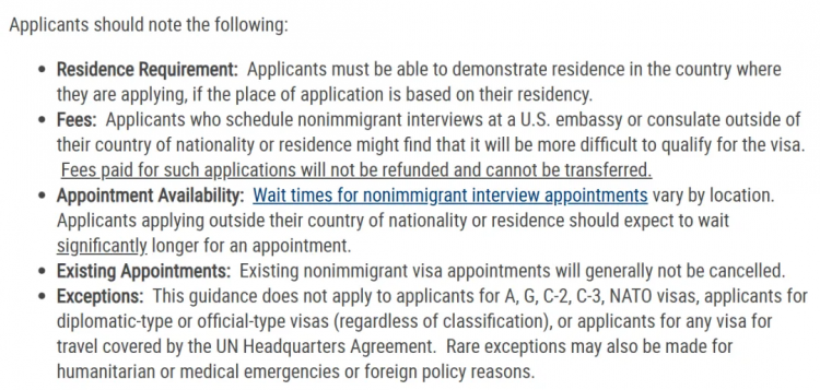 新規(guī)要求,申請(qǐng)人必須回到自己的母國(guó),或至少在自己合法長(zhǎng)期居住的國(guó)家完成簽證面談。換句話說(shuō),如果一個(gè)人在某地只是短期逗留、沒(méi)有居留身份,即便當(dāng)?shù)氐拿绹?guó)使領(lǐng)館有空檔,也不能再輕松預(yù)約。