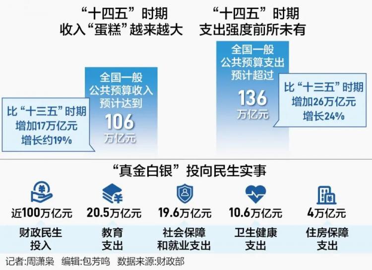 “十四五”時期,全國一般公共預(yù)算收入預(yù)計達(dá)到106萬億元,比“十三五”時期增加17萬億元,增長約19%;全國一般公共預(yù)算支出預(yù)計超過136萬億元,比“十三五”時期增加26萬億元,增長24%。