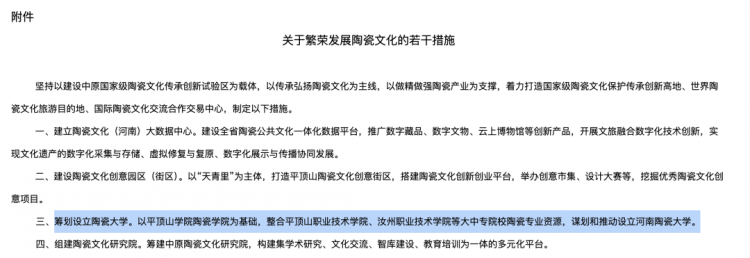 近日,河南省平頂山市人民政府辦公室印發(fā)《關(guān)于進(jìn)一步加快文旅產(chǎn)業(yè)高質(zhì)量發(fā)展的意見(jiàn)》。其中提到:籌劃設(shè)立陶瓷大學(xué)。以平頂山學(xué)院陶瓷學(xué)院為基礎(chǔ),整合平頂山職業(yè)技術(shù)學(xué)院、汝州職業(yè)技術(shù)學(xué)院等大中專院校陶瓷專業(yè)資源,謀劃和推動(dòng)設(shè)立河南陶瓷大學(xué)。