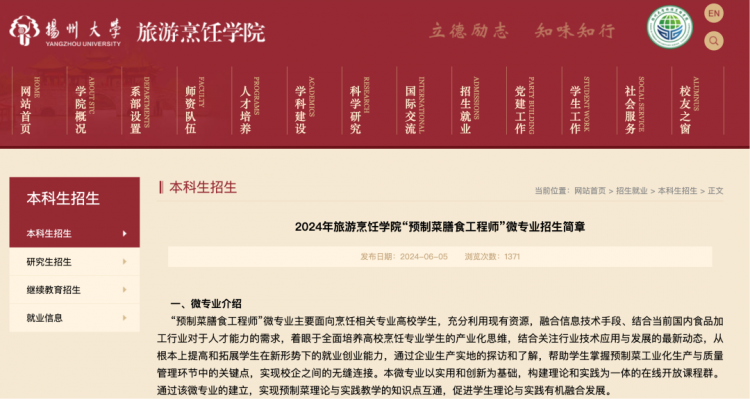 2023年5月,揚州大學(xué)官微發(fā)文,該校預(yù)制菜膳食工程師等微專業(yè)啟動招生工作。據(jù)了解,這是該校首次開設(shè)“預(yù)制菜”相關(guān)微專業(yè)。