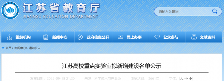 9月18日,江蘇省教育廳發(fā)布《江蘇高校重點(diǎn)實(shí)驗(yàn)室擬新增建設(shè)名單公示》,根據(jù)《省教育廳關(guān)于組織開展江蘇高校重點(diǎn)實(shí)驗(yàn)室申報(bào)建設(shè)工作的通知》(蘇教科函〔2025〕2號(hào))要求,經(jīng)學(xué)校遴選推薦,省教育廳組織專家進(jìn)行評(píng)議,擬新增建設(shè)江蘇高校重點(diǎn)實(shí)驗(yàn)室59個(gè),包括3個(gè)國(guó)家級(jí)重點(diǎn)實(shí)驗(yàn)室培育建設(shè)點(diǎn)、39個(gè)省高校重點(diǎn)實(shí)驗(yàn)室和17個(gè)省高校重點(diǎn)(建設(shè))實(shí)驗(yàn)室。