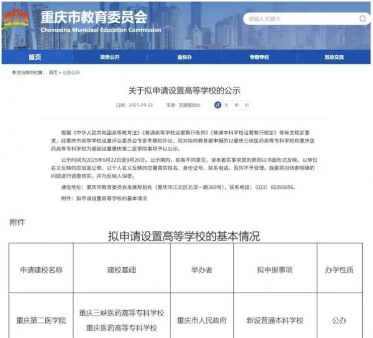 9月22日,重慶市教育委員會(huì)發(fā)布《關(guān)于擬申請?jiān)O(shè)置高等學(xué)校的公示》,根據(jù)《中華人民共和國高等教育法》《普通高等學(xué)校設(shè)置暫行條例》《普通本科學(xué)校設(shè)置暫行規(guī)定》等有關(guān)規(guī)定要求,經(jīng)重慶市高等學(xué)校設(shè)置評議委員會(huì)專家考察和評議,現(xiàn)對擬向教育部申報(bào)的以重慶三峽醫(yī)藥高等專科學(xué)校和重慶醫(yī)藥高等??茖W(xué)校為基礎(chǔ)設(shè)置重慶第二醫(yī)學(xué)院事項(xiàng)予以公示。