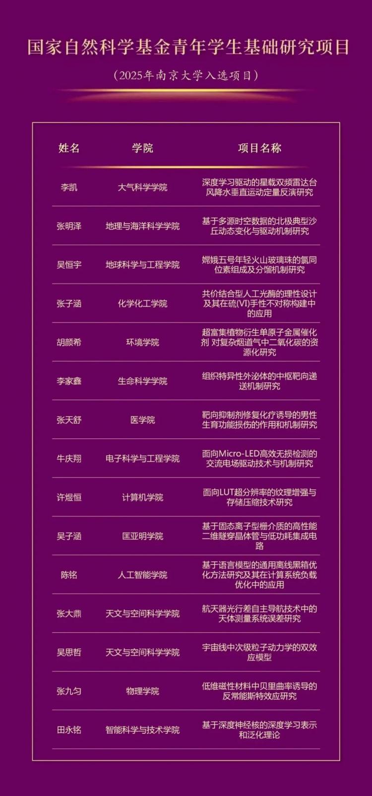 近日,國家自然科學基金委員會發(fā)布了2025年國家自然科學基金青年學生基礎(chǔ)研究項目(本科生)評審結(jié)果。經(jīng)過層層選拔,南京大學15名本科生獲得項目資助,選題均直面基礎(chǔ)科學艱深問題、科研攻關(guān)瓶頸難題、未來技術(shù)發(fā)展命題。
