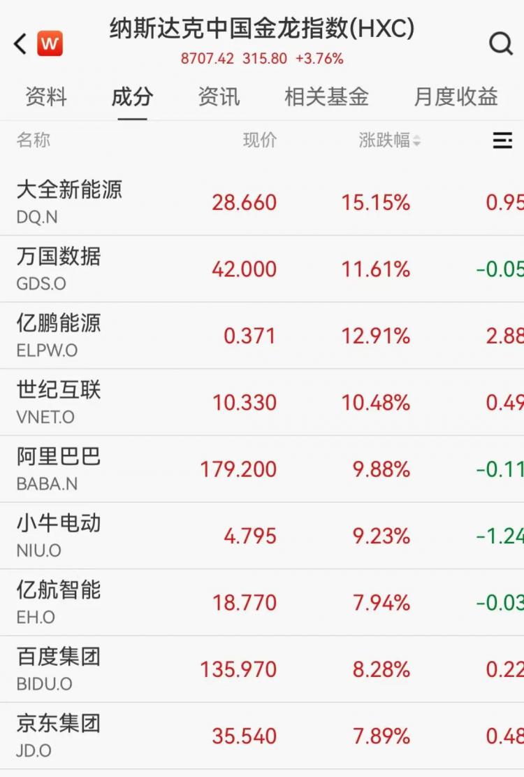 納斯達(dá)克中國(guó)金龍指數(shù)大漲超3.7%,多只中概股漲超10%。