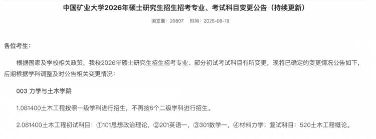 變化:不再按6個二級學科(巖土工程、結構工程等)招生,改為按一級學科統(tǒng)一招生。