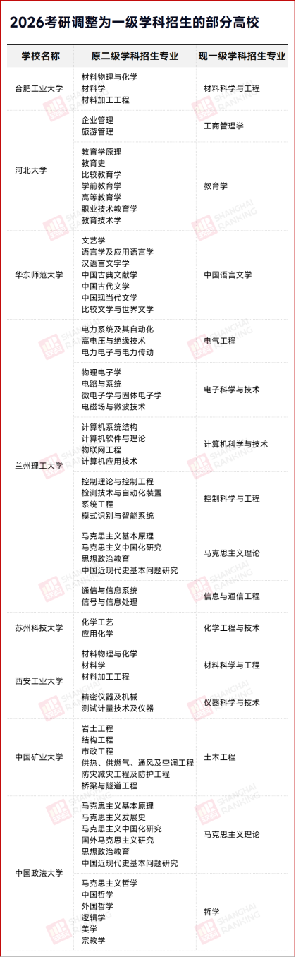 據(jù)統(tǒng)計,目前2026考研調整為一級學科招生的部分高校如下,歡迎大家補充~