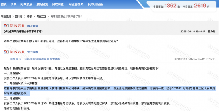 近日有網(wǎng)友在“問政四川”詢問“海事交通職業(yè)學(xué)院修建”一事,9月12日,成都國(guó)際鐵路港經(jīng)開區(qū)管委會(huì)回復(fù)稱:成都海事交通職業(yè)學(xué)院項(xiàng)目由成都恩大教育科技有限公司牽頭,受環(huán)境與投資因素影響,該企業(yè)無法按協(xié)議約定履約,經(jīng)協(xié)商一致,已于2025年1月3日與青白江區(qū)人民政府解除項(xiàng)目投資協(xié)議。