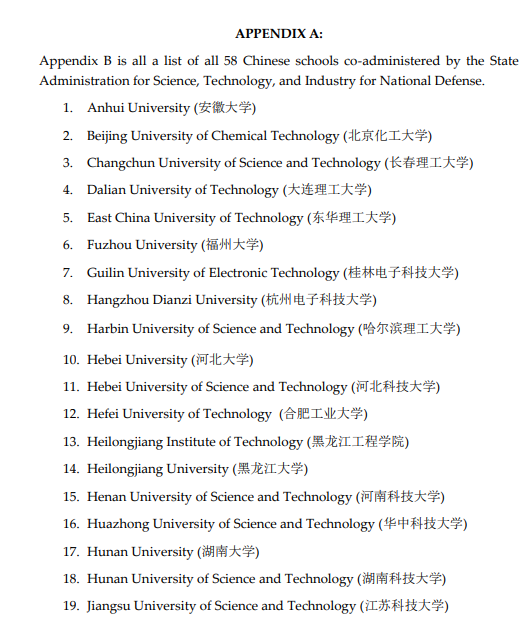 報告提出了多方面的限制建議,其中值得注意的一條是,這份報告被視為美國對華學術限制政策的延續(xù)和升級。2020年,特朗普政府簽署了“10043號總統(tǒng)令”,對于“國防七子”等高校的學子禁發(fā)F(學生簽證)或J(訪問學者簽證)簽證。