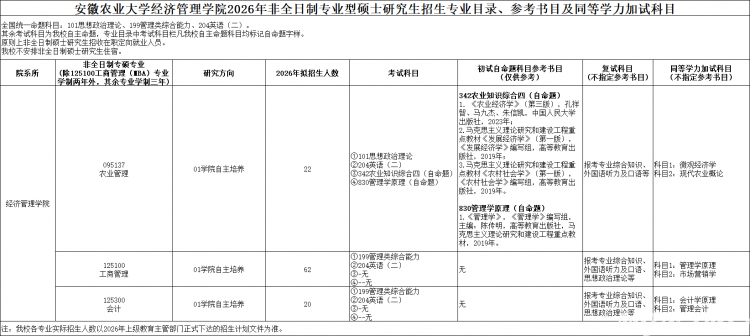 3. 安徽農(nóng)業(yè)大學(xué)經(jīng)濟(jì)管理學(xué)院2026年非全日制專業(yè)型碩士研究生招生專業(yè)目錄、參考書目及同等學(xué)力加試科目