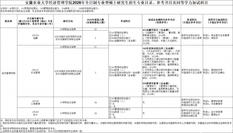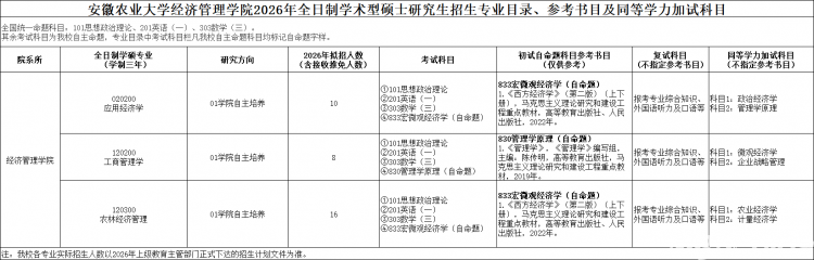 1.安徽農(nóng)業(yè)大學(xué)經(jīng)濟(jì)管理學(xué)院2026年全日制學(xué)術(shù)型碩士研究生招生專業(yè)目錄、參考書目及同等學(xué)力加試科目
