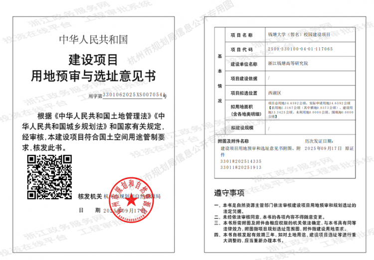 9月24日,杭州市規(guī)劃和自然資源局發(fā)布錢塘大學(xué)(暫名)校園建設(shè)項(xiàng)目的建設(shè)項(xiàng)目選址意見書和用地預(yù)審。文件表示,項(xiàng)目擬選位置為西湖區(qū),項(xiàng)目總用地34.6592公頃,實(shí)際申請用地34.6592公頃 。這表明,錢塘大學(xué)的選址和總用地面積已基本明確,整體建設(shè)工作將步入新階段。