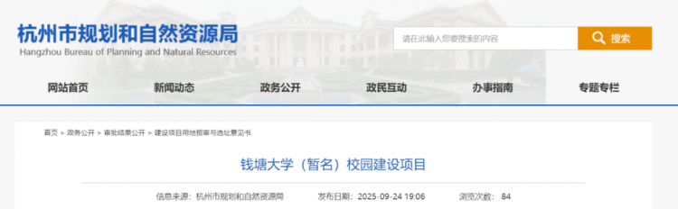 9月24日,杭州市規(guī)劃和自然資源局發(fā)布錢塘大學(xué)(暫名)校園建設(shè)項(xiàng)目選址意見書和用地預(yù)審,其選址西湖區(qū),總用地34.6592公頃,建設(shè)工作將步入新階段。今年5月,市長姚高員在政府工作報(bào)告中提及“積極籌辦錢塘大學(xué)”;去年12月,杭州市委會(huì)議明確2025年推動(dòng)籌辦。杭州市教育局官網(wǎng)顯示,目前市屬高校有7所。今年1月,鐘睒睒披露要?jiǎng)?chuàng)辦新型大學(xué),計(jì)劃10年捐贈(zèng)400億。此前報(bào)道稱,錢塘大學(xué)或?qū)⒁劳姓憬X塘基礎(chǔ)科學(xué)研究院籌建,該機(jī)構(gòu)法定代表人為鐘睒睒 。信息來源于杭州市規(guī)劃和自然資源局、浙江日報(bào)、杭州發(fā)布。