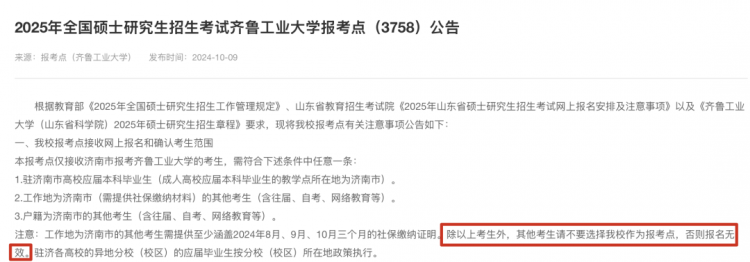 以齊魯工業(yè)大學(xué)報(bào)考點(diǎn)為例,公告里就明確說明了接收考生范圍。并且說明了除了以上考生,其他考生不要選擇我校作為報(bào)考點(diǎn),否則報(bào)名無效。