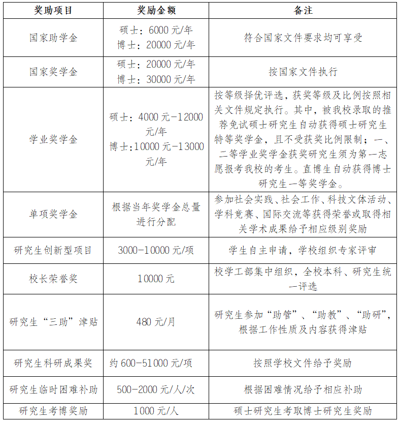 注:表中各類(lèi)獎(jiǎng)助學(xué)金僅面向全日制、非定向就業(yè)碩士研究生評(píng)選,評(píng)選細(xì)則以學(xué)校相關(guān)文件及通知為準(zhǔn)。