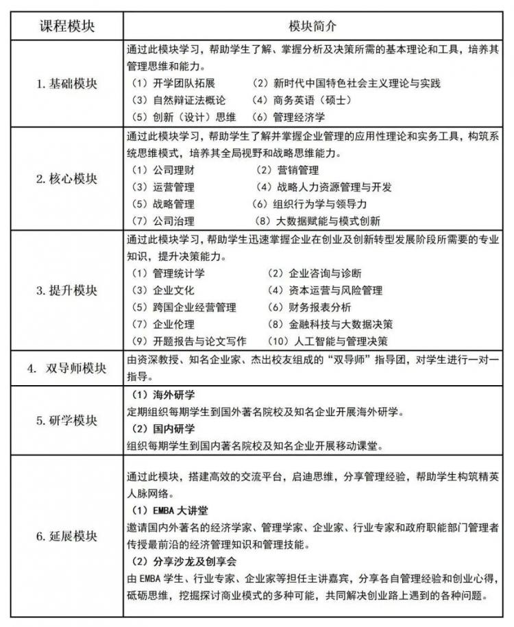 EMBA課程體系將課堂教學、案例討論、分享沙龍、大講堂、名家論壇、實戰(zhàn)模擬、企業(yè)參訪、國內(nèi)外研學等教學方法有機結(jié)合,通過系統(tǒng)的商科管理教育,培養(yǎng)EMBA學生的創(chuàng)新思維、全面提升學生的管理能力和決策能力。