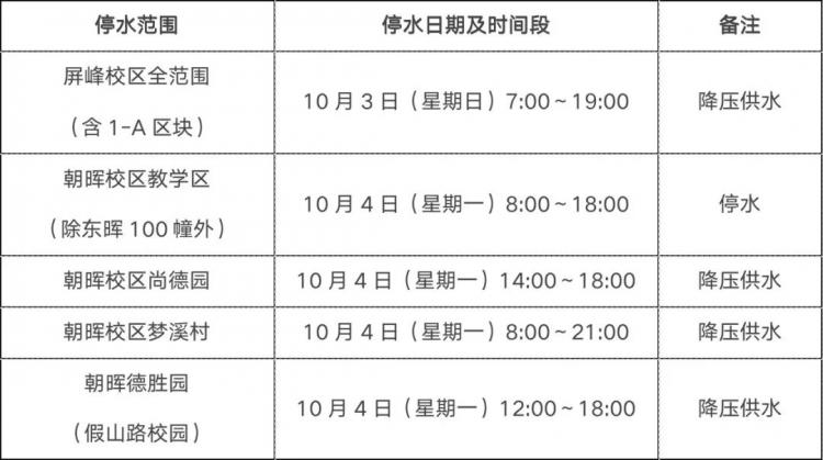因自來水公司清洗水池需要,10月3日-4日(國慶長假期間)屏峰、朝暉兩校區(qū)將停水或降壓供水,具體如下: