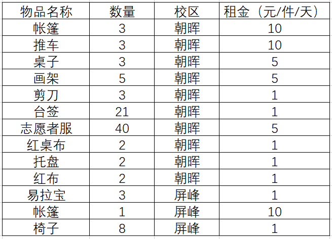 為了更好地服務(wù)同學(xué)們,公關(guān)部需收取少量的租金,僅用于日常非消耗性出借物資的的維修與完善。租金的來源與用途將進(jìn)行陽光公示。