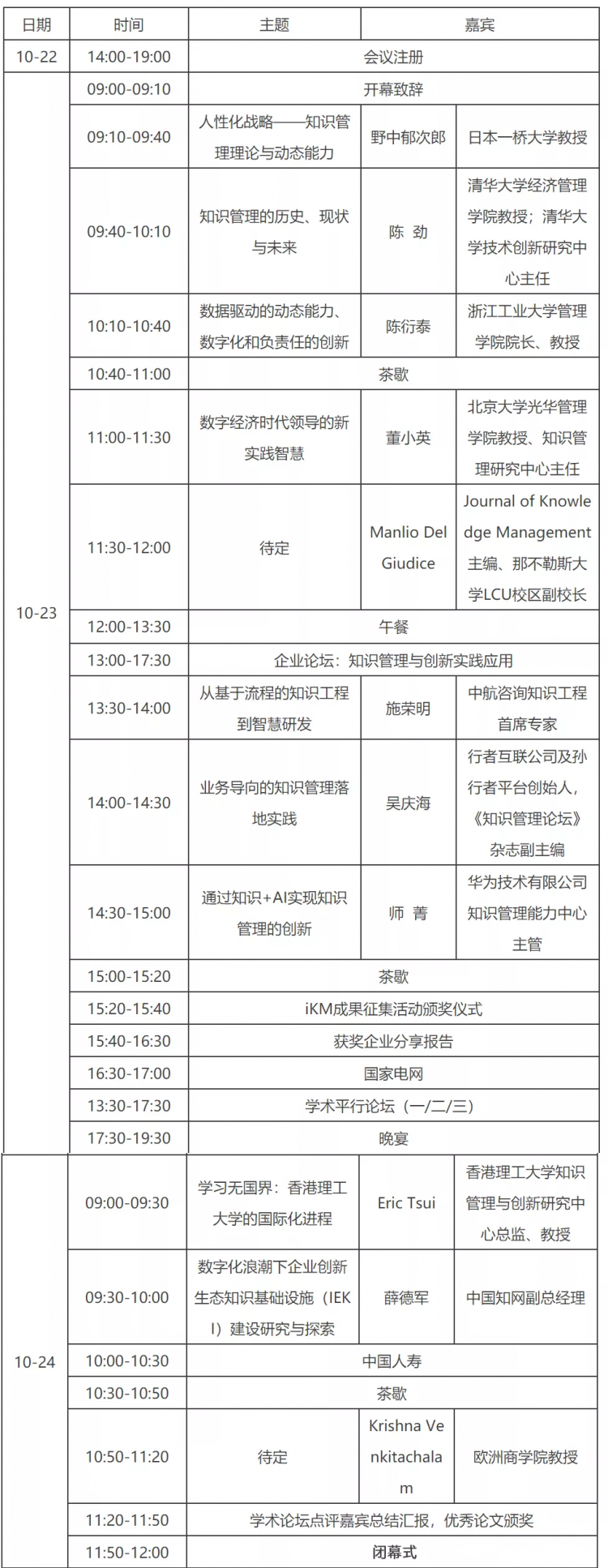 第四屆創(chuàng)新與知識管理國際會議(iKM2021)將于2021年10月22-24日在杭州召開。會議由清華大學(xué)技術(shù)創(chuàng)新研究中心發(fā)起,清華大學(xué)技術(shù)創(chuàng)新研究中心、浙江工業(yè)大學(xué)管理學(xué)院、同方知網(wǎng)(北京)技術(shù)有限公司聯(lián)合主辦,以“面向動態(tài)能力的創(chuàng)新與知識管理”為主題,邀請了全球知識管理大師、日本一橋大學(xué)教授野中郁次郎教授,SSCI期刊Journal of Knowledge Management主編、那不勒斯大學(xué)LCU校區(qū)副校長Manlio Del Giudice教授,香港理工大學(xué)知識管理與創(chuàng)新研究中心總監(jiān)Eric Tsui教授,歐洲商學(xué)院Krishna Venkitachalam教授,清華大學(xué)技術(shù)創(chuàng)新研究中心主任、經(jīng)濟管理學(xué)院陳勁教授,北京大學(xué)知識管理研究中心主任董小英教授,浙江工業(yè)大學(xué)管理學(xué)院院長陳衍泰教授等在內(nèi)的十余位海內(nèi)外專家學(xué)者,以及來自中國人壽、國家電網(wǎng)、華為等的實踐者共聚一堂,共話創(chuàng)新與知識管理的未來。