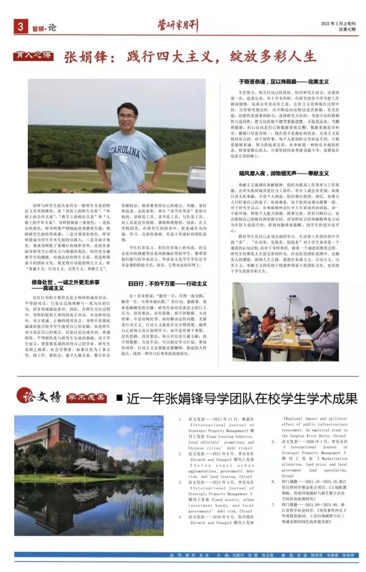 為加強(qiáng)學(xué)院導(dǎo)師團(tuán)隊(duì)之間的溝通交流,營造導(dǎo)學(xué)共進(jìn)的良好氛圍,管理學(xué)院新創(chuàng)《管研半月刊》??镌O(shè)“管研·思”、“管研·師”、“管研·論”三個(gè)板塊,分別對應(yīng)研究生思想建設(shè)、導(dǎo)學(xué)團(tuán)隊(duì)故事、導(dǎo)師育人心得以及學(xué)生學(xué)術(shù)成果,每期聚焦一個(gè)導(dǎo)學(xué)團(tuán)隊(duì)進(jìn)行征稿??锵Mㄟ^聚焦黨史、時(shí)政熱點(diǎn),引領(lǐng)研究生守初心、擔(dān)使命;通過講述優(yōu)秀的導(dǎo)學(xué)故事,傳播導(dǎo)學(xué)文化正能量;匯聚導(dǎo)師育人心得與學(xué)生科研成果,助推全院導(dǎo)師和研究生能力共提升。