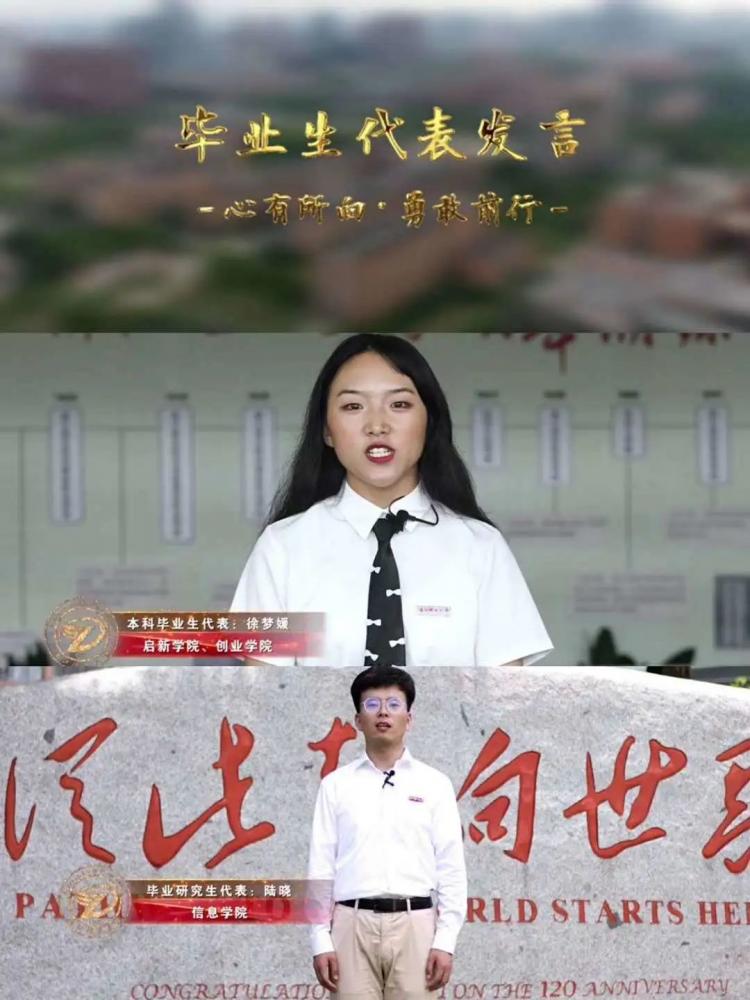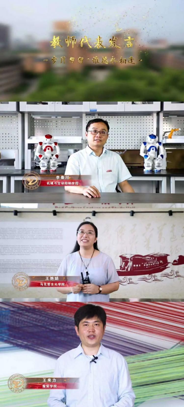 啟新學(xué)院、創(chuàng)業(yè)學(xué)院徐夢(mèng)媛和信息學(xué)院陸曉作為畢業(yè)本科生代表和畢業(yè)研究生代表發(fā)言;機(jī)械與自動(dòng)控制學(xué)院李秦川、馬克思主義學(xué)院王艷娟、服裝學(xué)院王來(lái)力作為教師代表發(fā)言;學(xué)校教職工代表集體為2020屆畢業(yè)生送上真摯祝福;1977級(jí)絲綢機(jī)械專業(yè)校友葉文、2001級(jí)信息與計(jì)算科學(xué)專業(yè)校友陳燎罕、2014級(jí)土木工程材料專業(yè)校友謝征兵作為校友代表深情寄語(yǔ)畢業(yè)生。典禮還在線表彰了一批省級(jí)和校級(jí)優(yōu)秀畢業(yè)生及新一屆研究生支教團(tuán)成員。