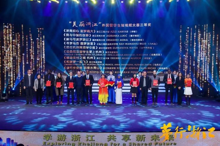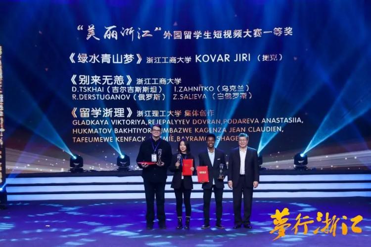 晚會現(xiàn)場,舉行了“美麗浙江”國際短視頻大賽頒獎典禮,浙江理工大學(xué)選送的視頻《留學(xué)理工》獲得“美麗浙江”國際短視頻大賽一等獎,陳文興也應(yīng)邀為獲獎代表頒獎。
