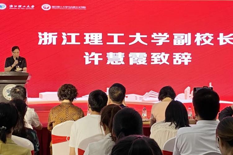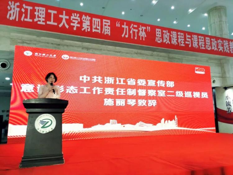 中共浙江省委宣傳部二級(jí)巡視員施麗琴致辭。她給予此次活動(dòng)充分的肯定。她表示,學(xué)校思政課建設(shè)善于把理論研究與實(shí)踐教學(xué)有機(jī)融合,這是非常值得借鑒的。