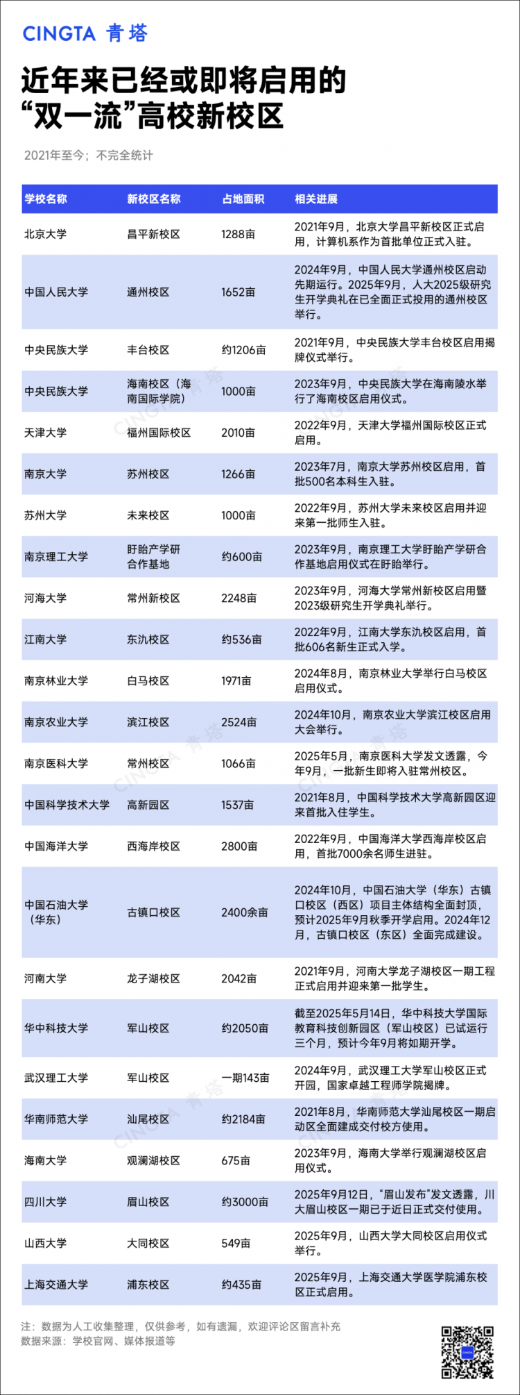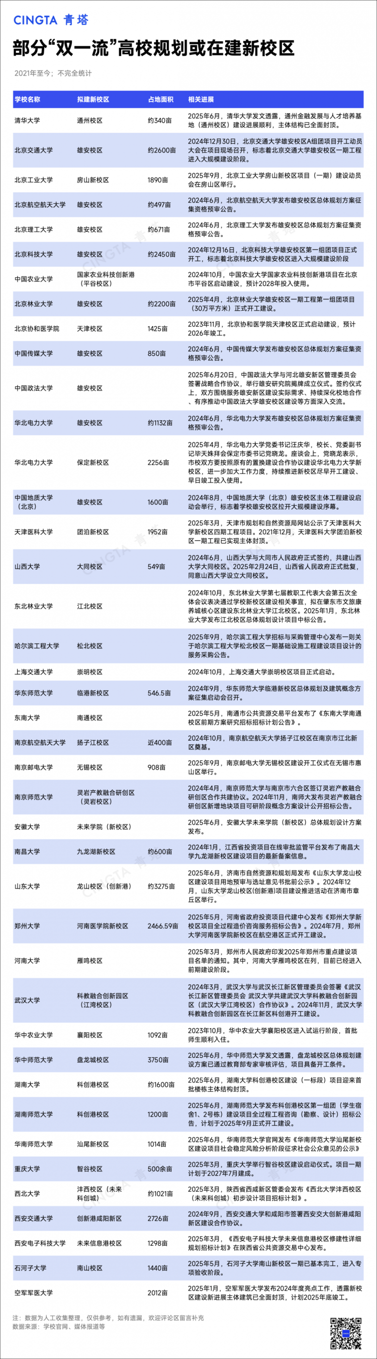 據(jù)不完全統(tǒng)計,2021年至今,我國至少有58所“雙一流”高校傳出已經(jīng)或計劃建設(shè)新校區(qū)的相關(guān)消息。