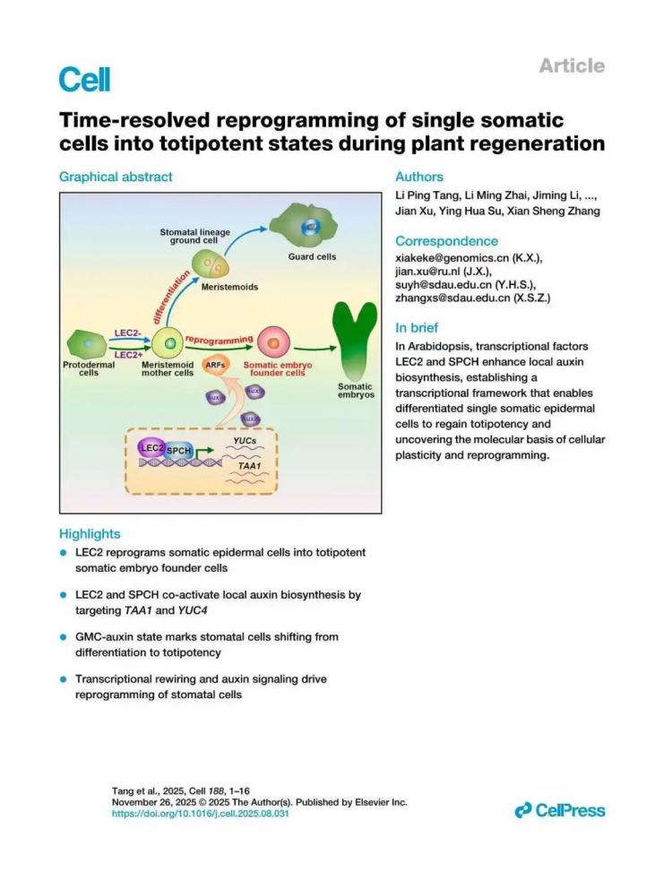 近日,山東農(nóng)業(yè)大學(xué)張憲省教授和蘇英華教授研究團(tuán)隊(duì)首次完整揭示單個(gè)植物體細(xì)胞經(jīng)基因重編程發(fā)育為完整植株的全過程。此成果破解“植物細(xì)胞全能性”機(jī)制之謎,為作物遺傳改良與高效再生提供新理論支撐。9月16日該成果在《細(xì)胞》在線發(fā)表,山農(nóng)大是第一完成單位,多位學(xué)者為共同通訊和第一作者。研究獲多項(xiàng)基金資助?!禖ell》審稿人及中科院院士種康、楊維才高度評(píng)價(jià),認(rèn)為該研究原創(chuàng)性強(qiáng)、意義重大,首次明確植物全能干細(xì)胞起源,揭示關(guān)鍵分子機(jī)制,在概念上有重要突破,為作物再生體系優(yōu)化提供藍(lán)圖,還為破解“再生瓶頸”開辟新路徑。
