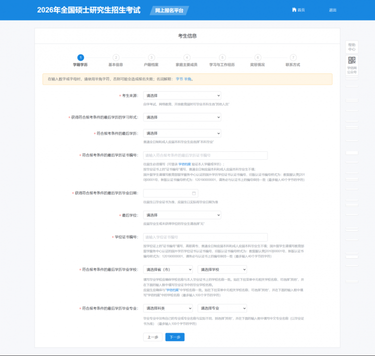 確認(rèn)實(shí)名注冊(cè)信息后,考生首先要按照《2026年全國碩士研究生招生工作管理規(guī)定》要求填寫正確的學(xué)歷(學(xué)籍)信息。